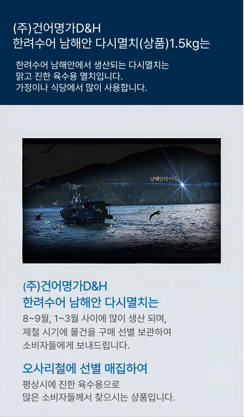 건어명가 동해 남해안 한려수어 다시멸치(대멸치)1.5kg상품/청정해역에서 생산된 남해안한려수어멸치 ,정치망멸치,죽방멸치 참좋아요^^ 무침용,볶음용,육수용좋아요^^ 다시멸치^^ [원산지:국산(경상남도 창원시 마산합포구)]
