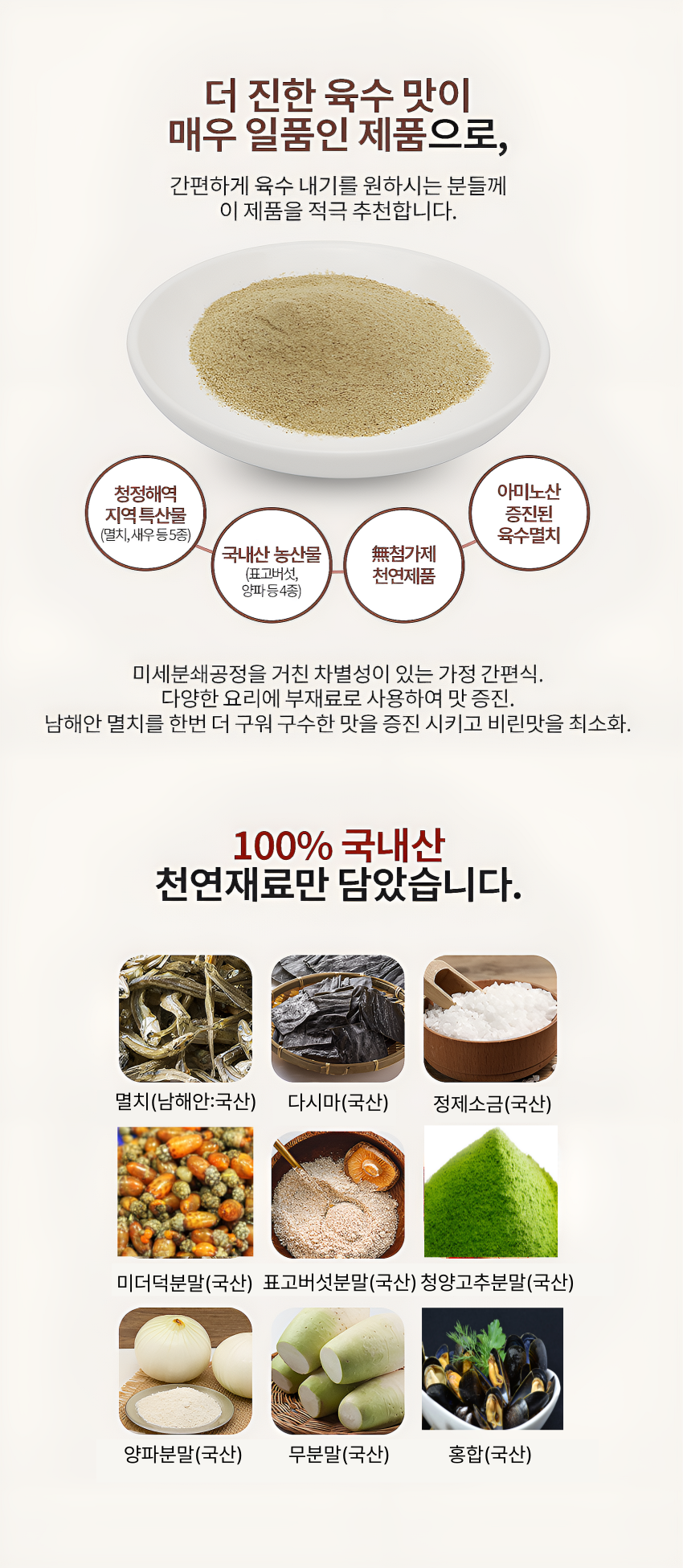 청정해역 지역특산물 (멸치,미더덕,홍합,다시마,새우6종과 농산물(표고버섯,양파등4종)으로 만든 첨가제를 사용하지않은 천연제품으로 단백질 분해능을 이용한 아미노산이 증진되 육수스틱입니다.