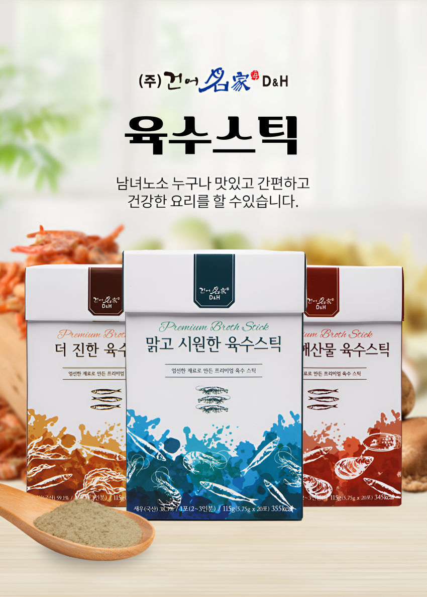 1스틱으로 2~3인분으로 다양한 육수요리(진한맛,시원한맛,감칠맛,고소한맛)등을 낼수있는 건어명가 대표상품입니다.(HACCP인증)