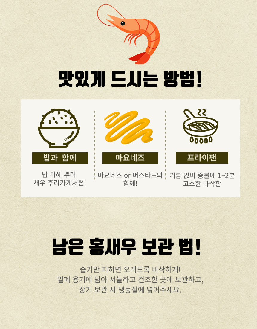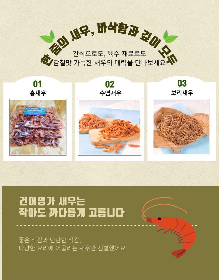 육수, 볶음, 조림 / 선홍색 마른 새우. 깊은 국물 맛과 감칠맛