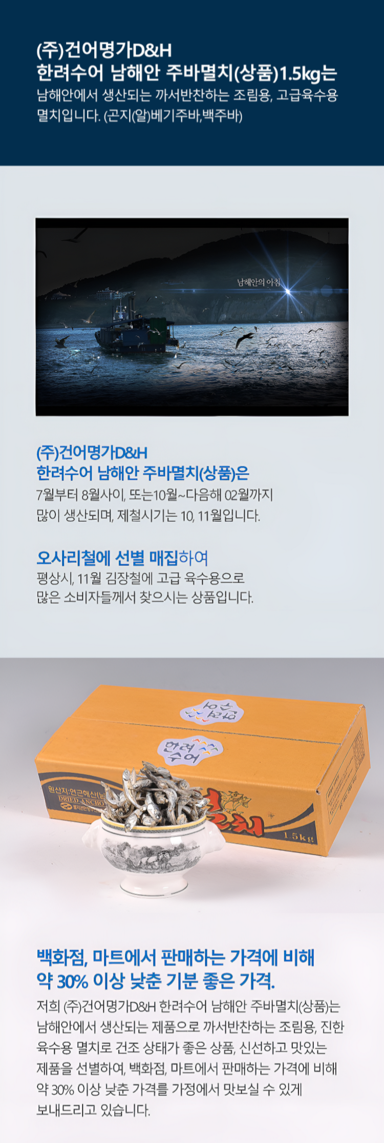 (주)건어명가D&H-명품 남해안 한려수어 주바멸치(중 멸치)1.5kg/청정해역에서 생산된 남해안 한려수어멸 치/정치망멸치/죽방멸치/무침용,볶음용으로 좋아요^^